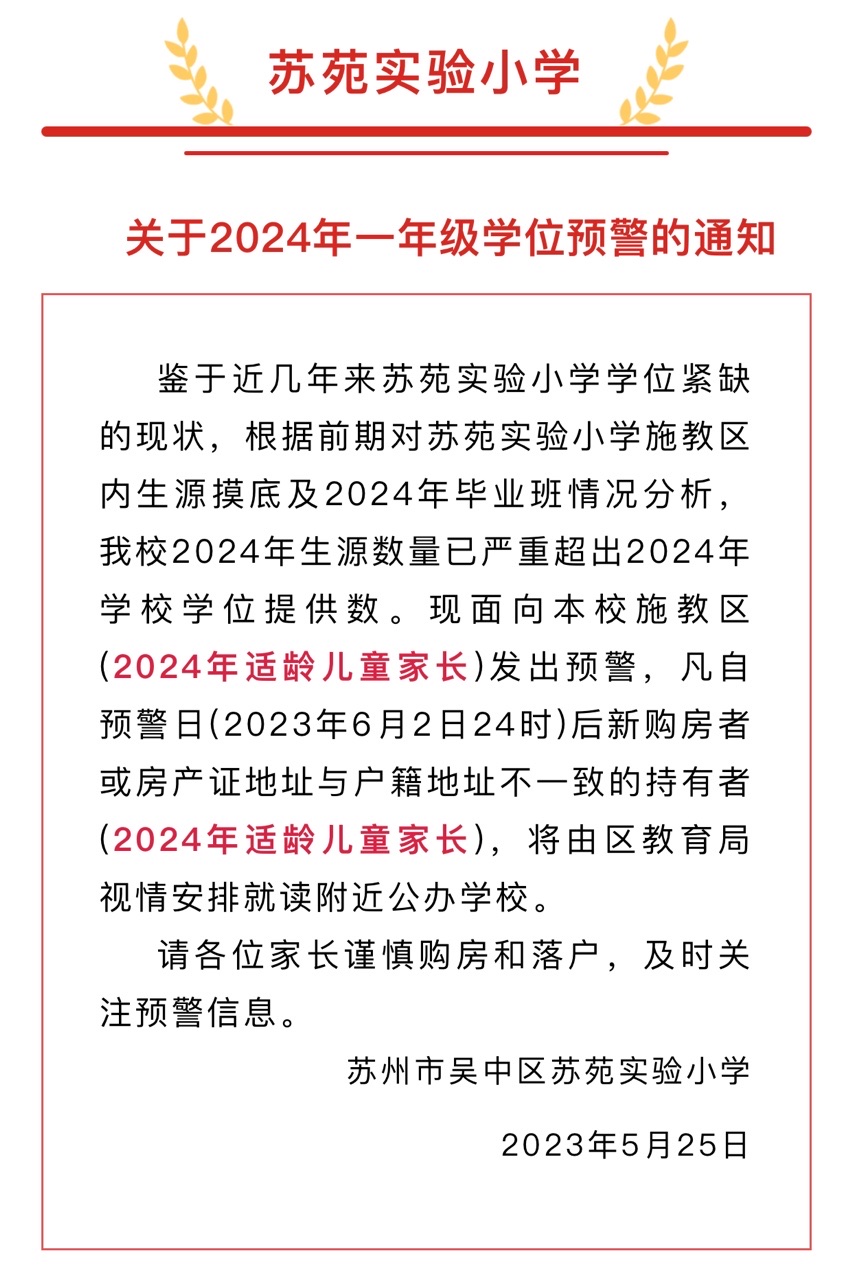 附:《苏苑实验小学关于2024年一年级学位预警的通知》