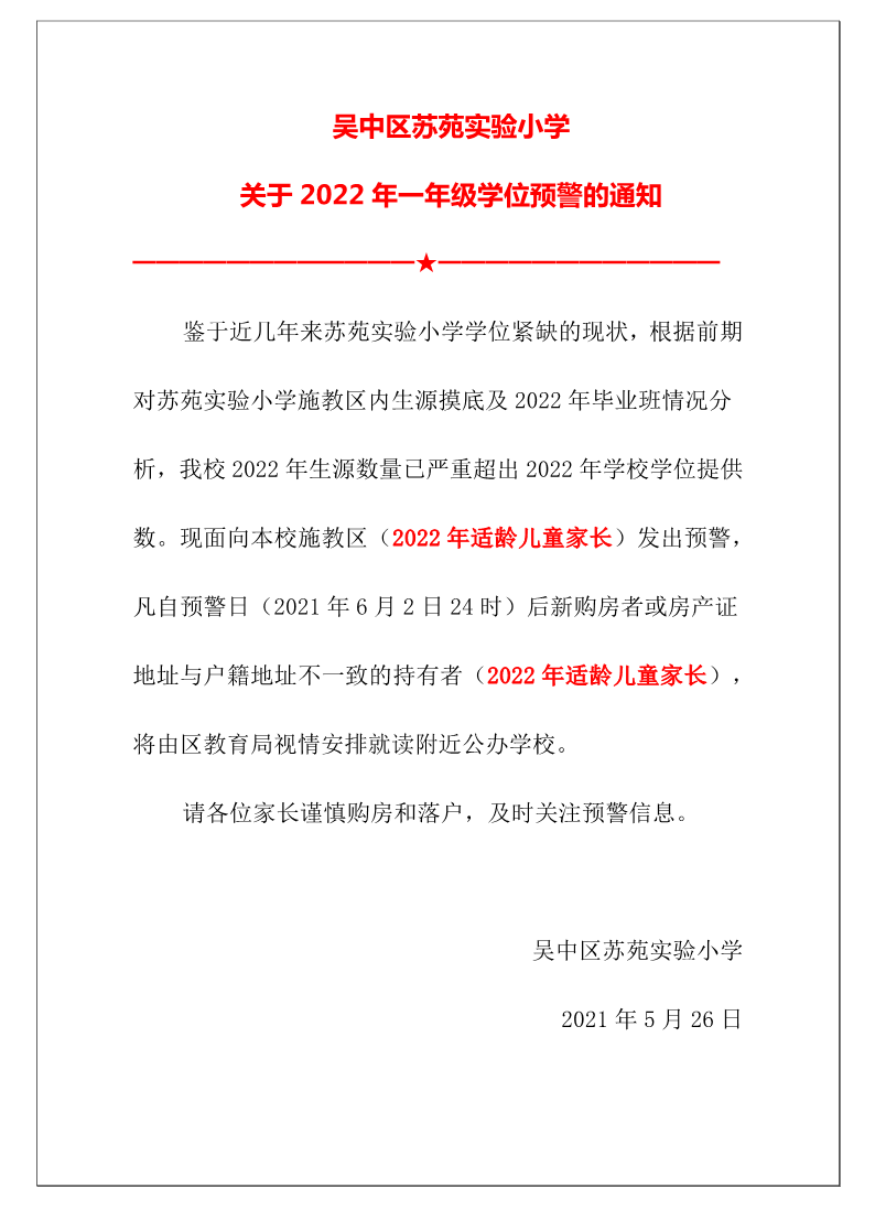 附2:吴中区苏苑实验小学关于2022年一年级学位预警的通知