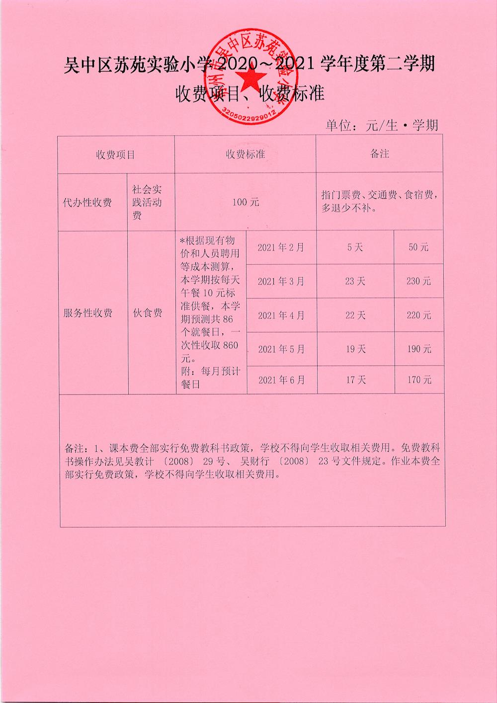 苏苑实小2020—2021学年度第二学期收费项目、收费标准