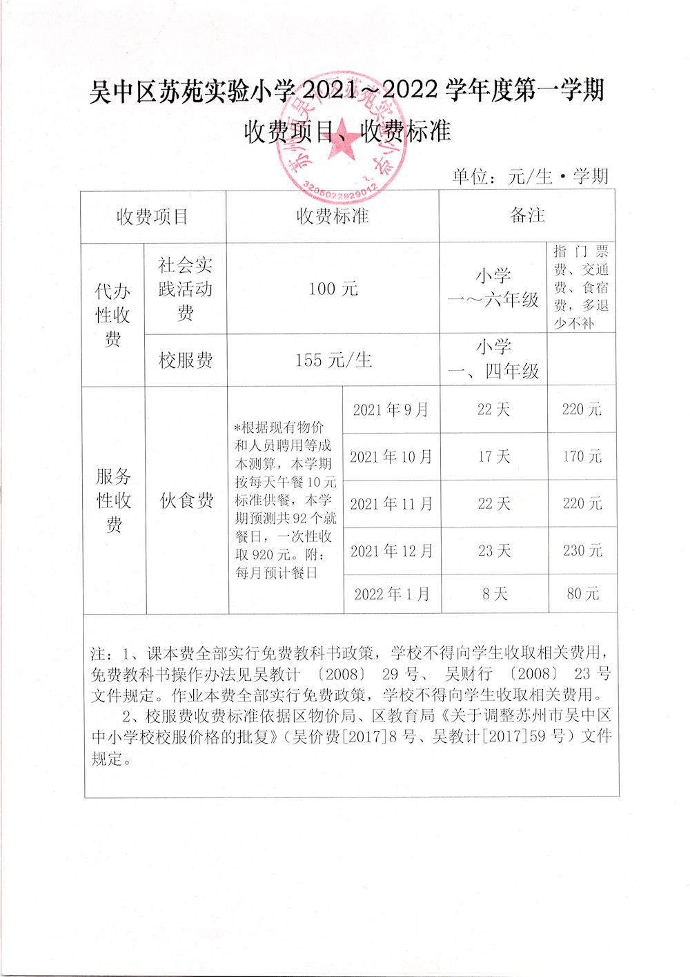 苏苑实小2021—2022学年度第一学期收费项目、收费标准