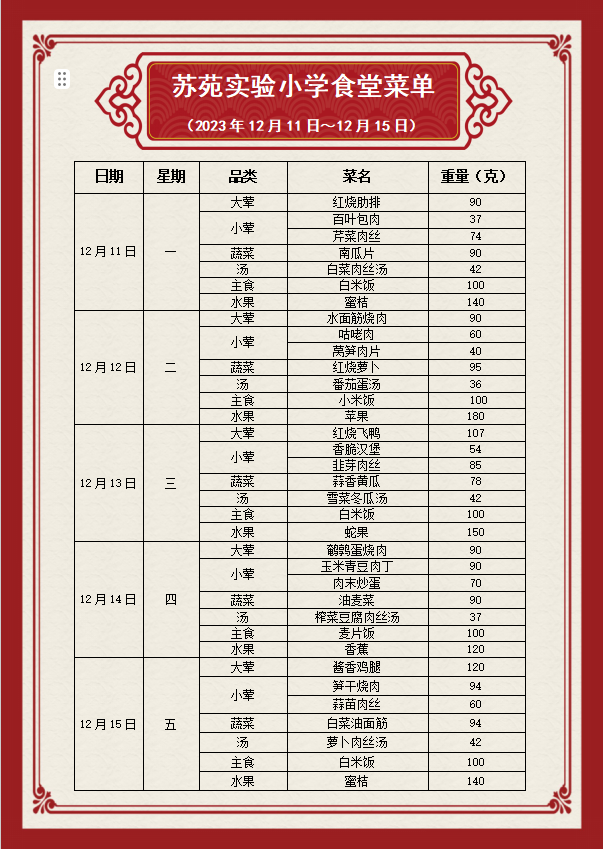 吴中区苏苑实验小学食堂菜单(2023.12.11~2023.12.15)