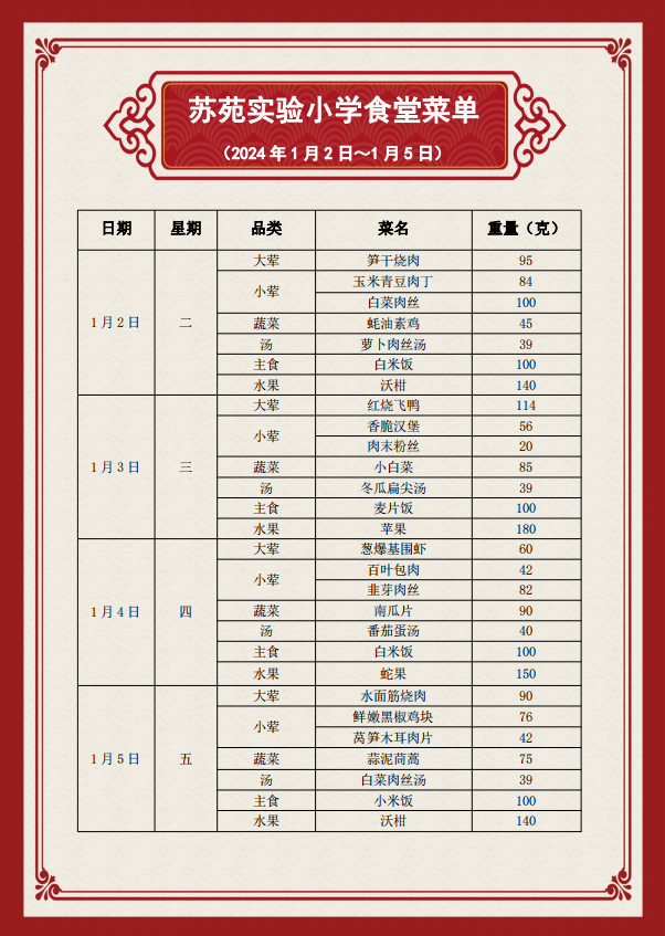 吴中区苏苑实验小学食堂菜单(2024.1.2~2024.1.5)